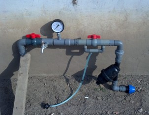 文丘里施肥器需要与灌溉系统供水管路控制阀并联使用,使用时将控制阀门关小,造成控制阀门前后有一定的压差,使水流经过安装文丘里施肥器的支管,利用水流通过文丘里管产生的真空吸力,将肥料溶液从敞口的肥料桶中均匀吸入管道系统进行施肥。